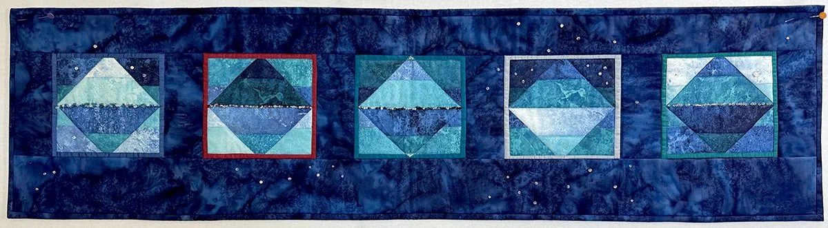 “Five Mountains”, 11" x 42" Batik cotton, ombre cotton, Thai silk, glass beads, Swarovski crystals & metallic thread.