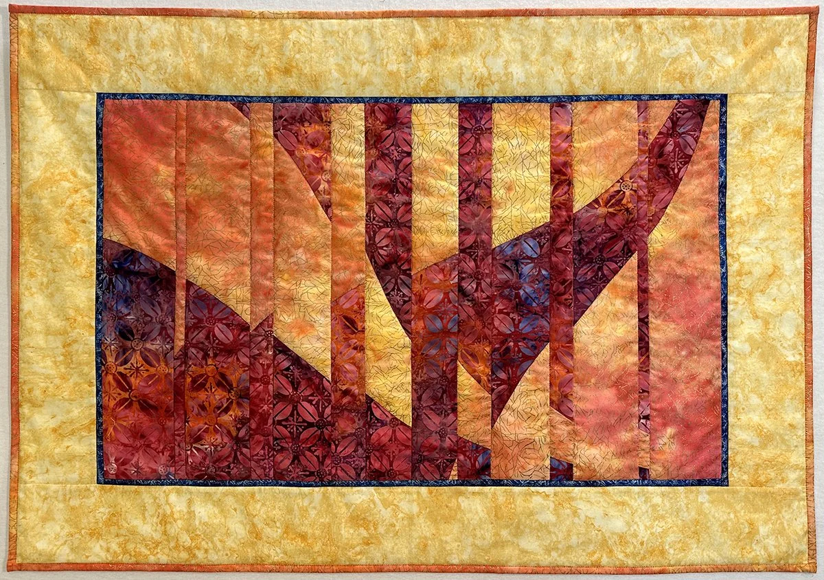 “Sunset”, 23.5" x 33", Dyed batik cotton and gold embossed cotton fabric.